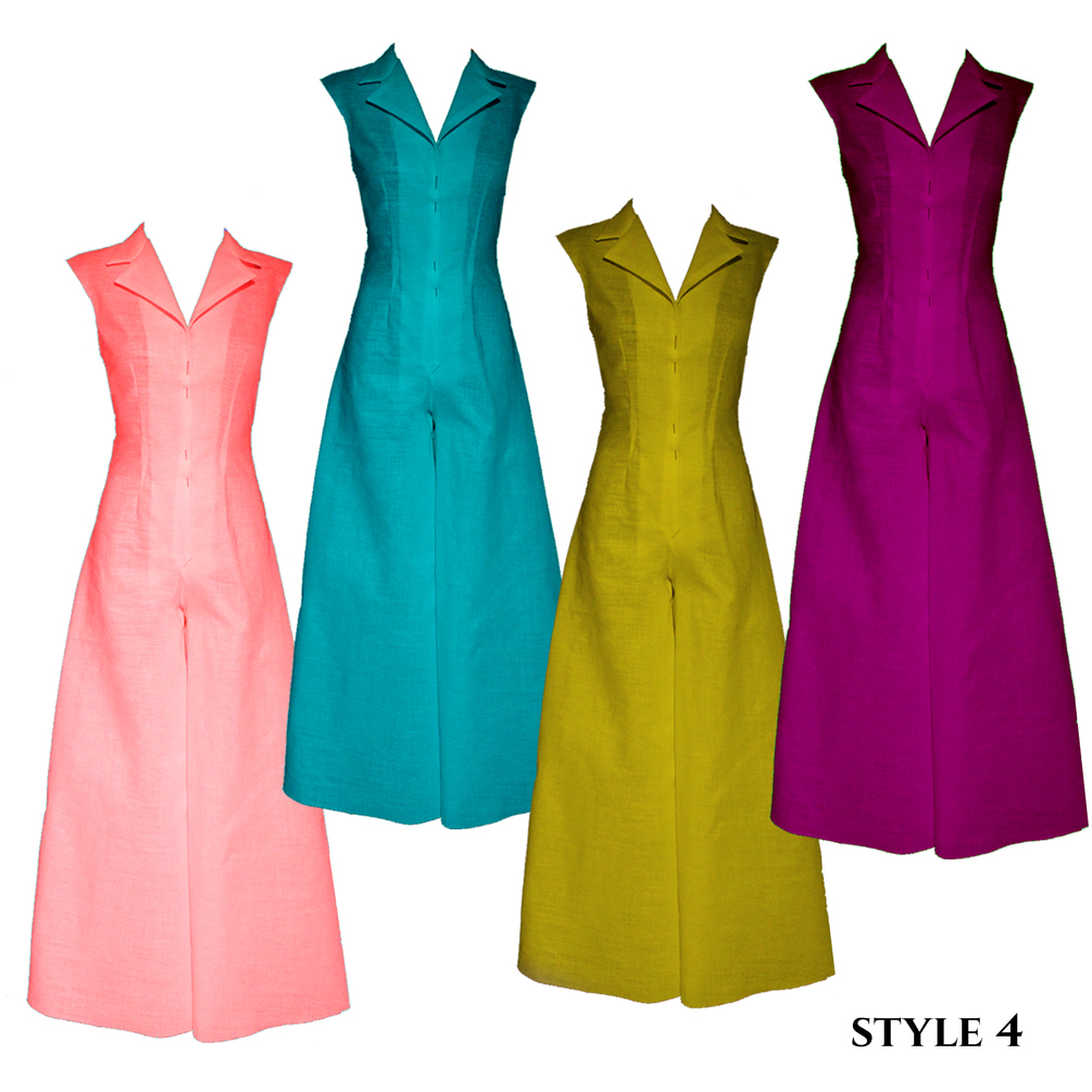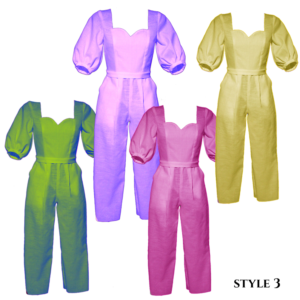 You’ll see how the jumpsuit can be made both with or without a waist seam, how to add pockets, button- or zipper closures, a collar with lapels, and how to create different pant leg shapes.