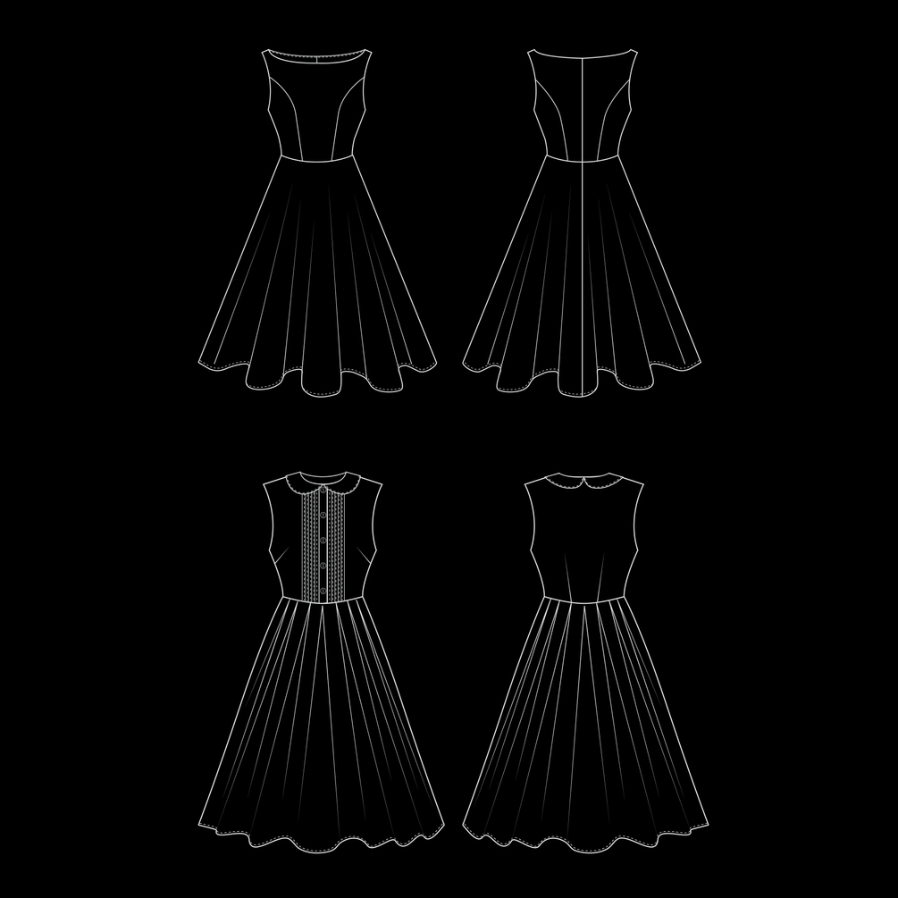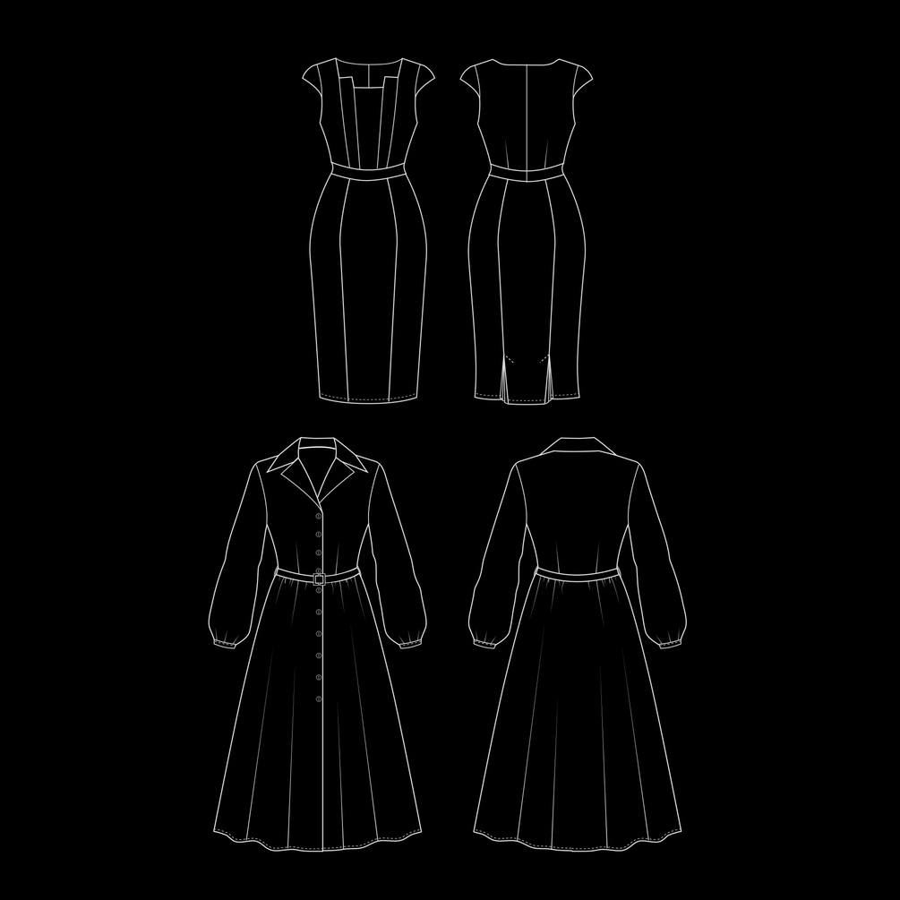 The theme of this guide is vintage-inspired dresses from the 50s and 6os. There are three styles with a fitted bodice and a full skirt: a 50s style swing dress, a button-up dress with tucks, and a shirt dress with a large notch collar. But also one, rockabilly inspired, pencil dress with style line details and kick pleats.