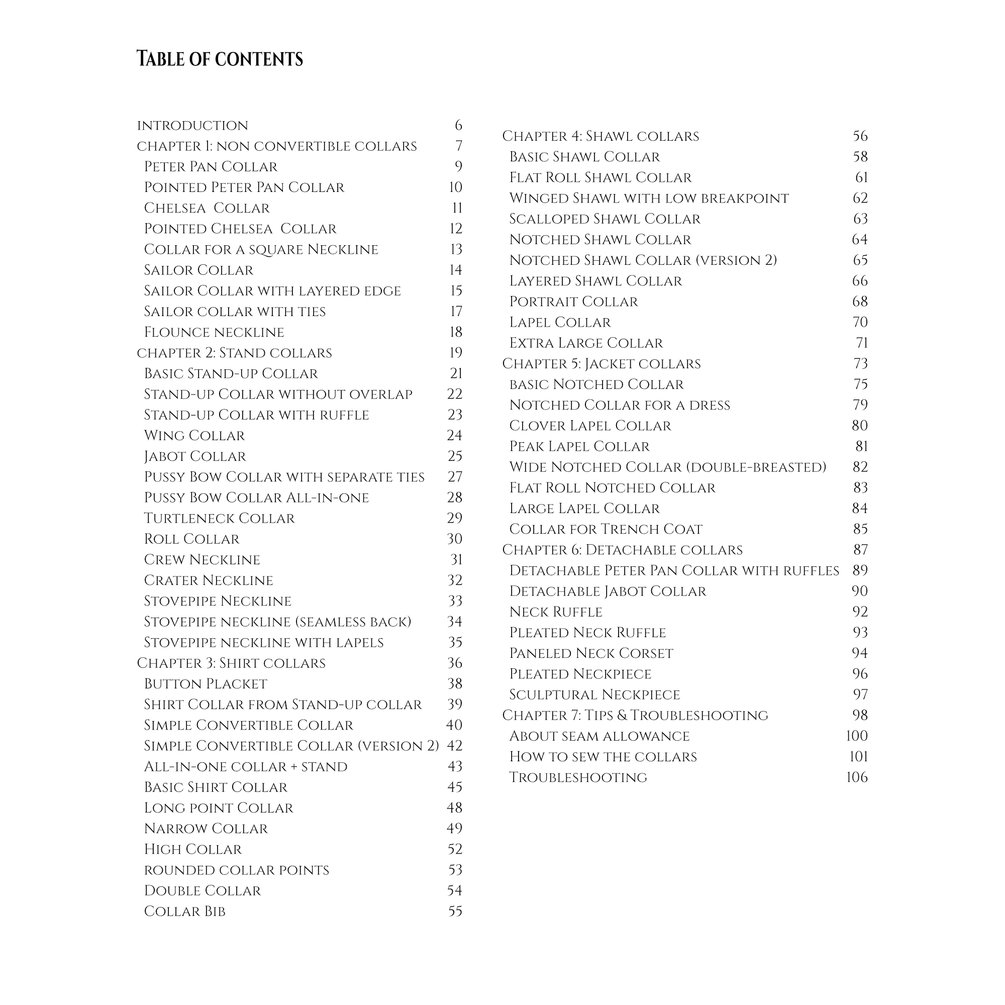 The collars have been divided into six chapters based on their features or how they are drafted. There's also a chapter where I've included some quick sewing instructions and a troubleshooting section.
